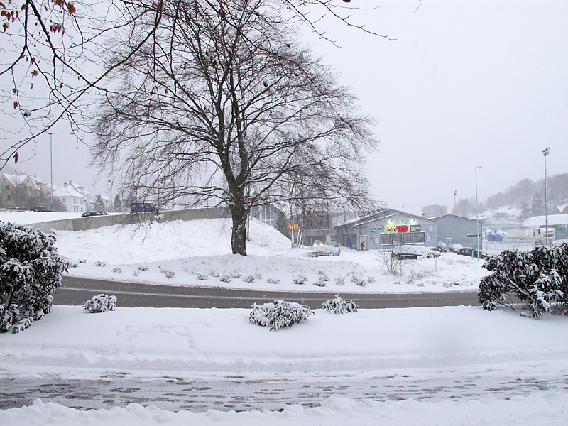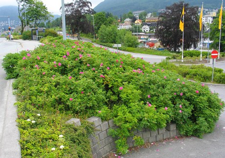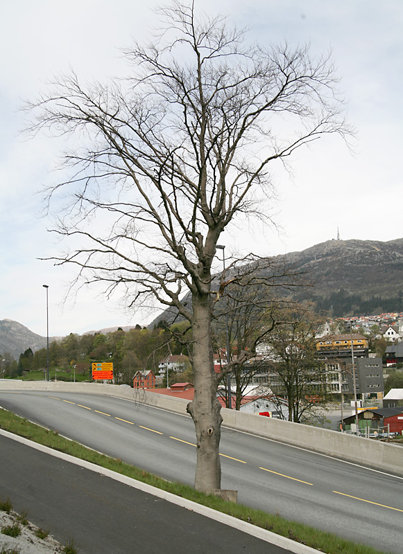 På dette sommerlige bildet, fra juni 2004, ser vi i bakgrunnen to av bøketrærne i Minde Allé. Dette er vel restene av alléen som i sin tid ga denne veien navn? Rosebedet i forgrunnen forsvant i forbindelse med bygging av ny rundkjøring og undergang under Fjøsangerveien. Se post fra 29. mars 2008. På bildet fra dengang ser vi ømfattende graving rundt det øverste treet, noe som kanskje var medvirkende til at treet nå er dødt. Det ble fjernet nå i november.