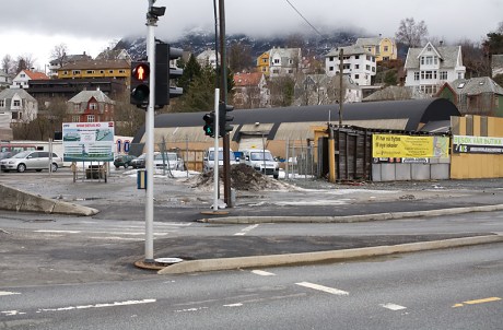I krysset Minde Allé / Kanalveien er det kommet opp skilt med «Ledige lokaler» i todelt nybygg som skal oppføres på stedet.