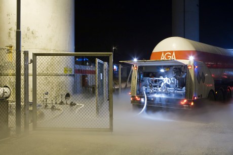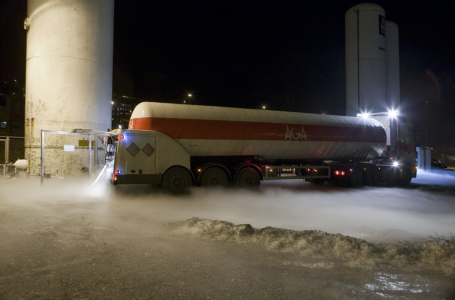 En tankbil fyller oksygen fra tank på Mindemyren. Tankene står på perrongen der Minde jernbanestasjon var en gang i tiden.