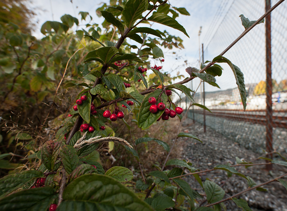 Langs veien mellom jernbanen og Florvaag Bruk (Montér) på Mindemyren er et langt, smalt ingenmannsland. Her trives bringebær, selje og mange andre busker og trær.
