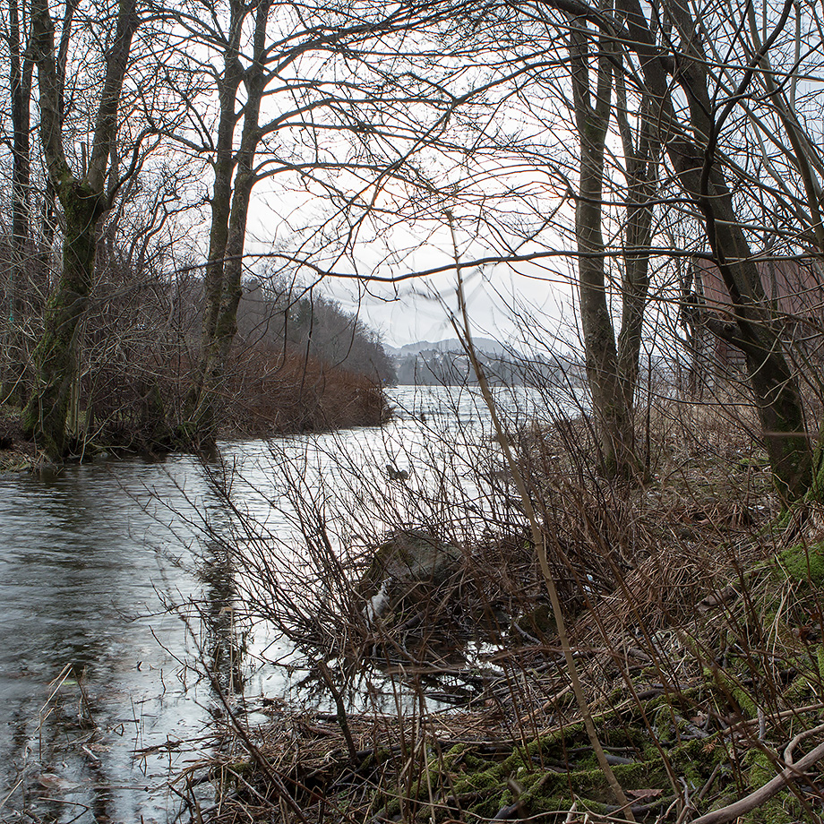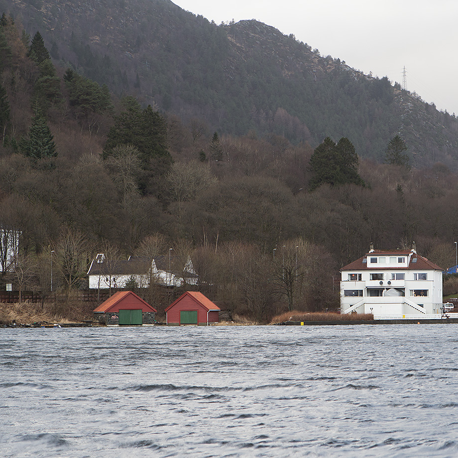 Fjøsangervassdragets naturlige utløp er innerst i Fjøsangerbukten. I dag er det bare en liten del av vannet fra nedslagsfeltet som renner ut her. «Det meste av vannet føres i tunnell fra Kristianborg til Knappen renseanlegg før utløp i Grimstadfjorden» – Faktaark fra Bergen kommune.