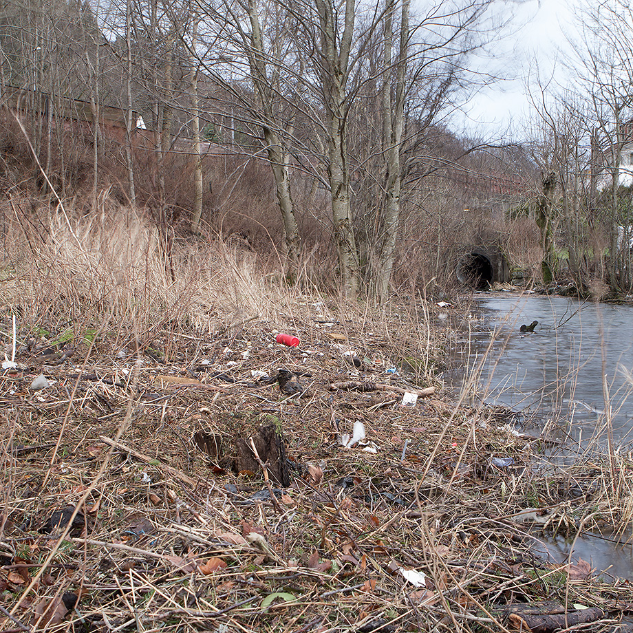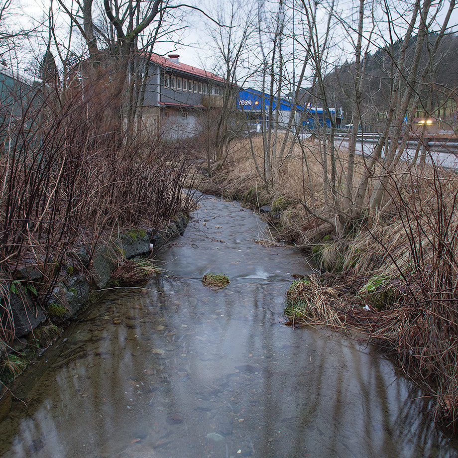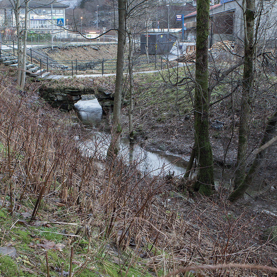 Det som er igjen av det naturlige løpet kommer ut på sørvestsiden av Fjøsangerveien, ved Karmbua. Elven renner videre forbi REMA 1000, under rundkjøringen ved Straumeveien og ut i Nordåsvannet.