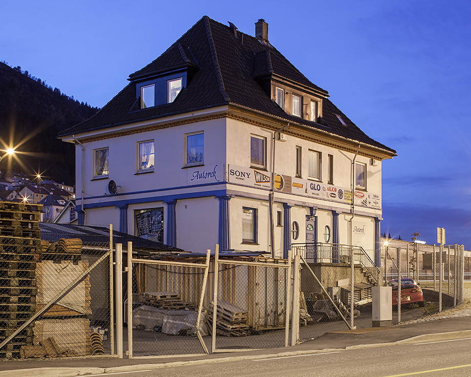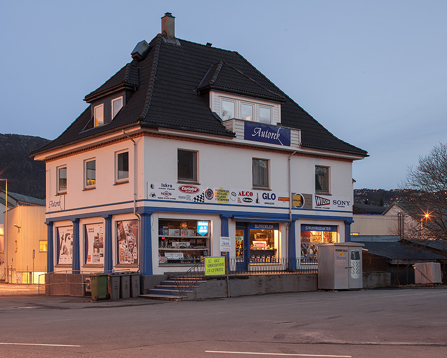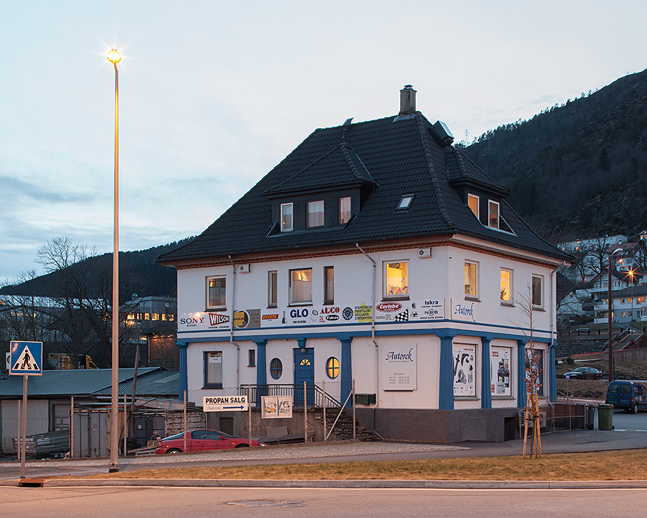 Apotek — atotek — atorek — Autorek. Minde Allé 26B bygget i 1927 i «bergensk klassisisme» med doriske søyler på fasaden. Tidligere apotek, nå utsalg av bilrekvisita.