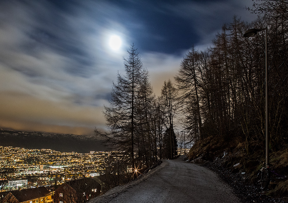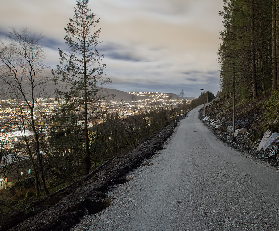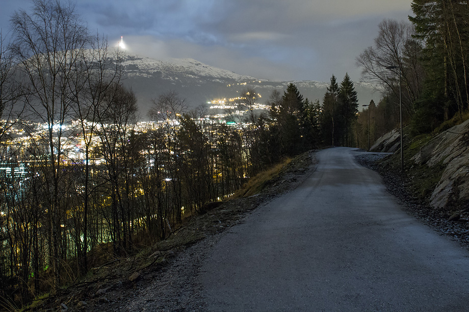 Stille her i kveldingen og flott utsikt mot sentrum, Solheim og Mindemyren.