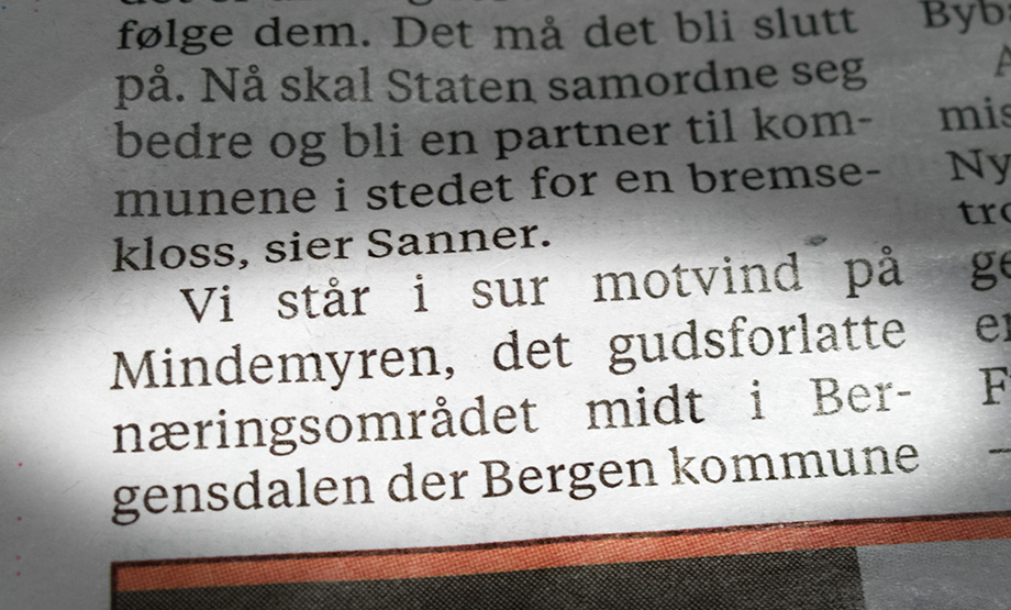 «… Mindemyren, det gudsforlatte næringsområdet midt i Bergensdalen» skriver BT i gårsdagens avis.
