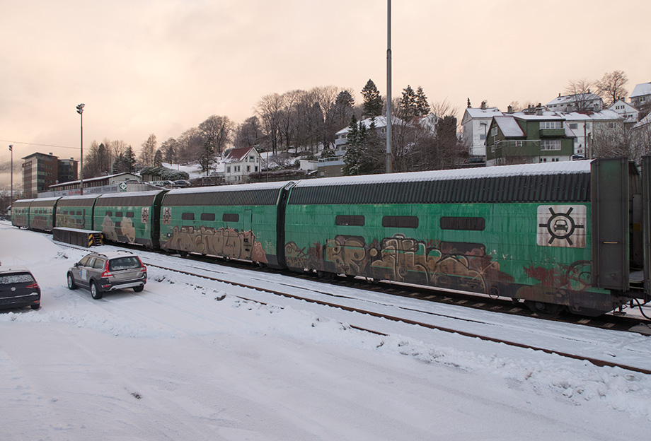 Det grønne toget er ikke så grønt lenger men kommmer med jevne mellomrom til Mindemyren fullt av biler.