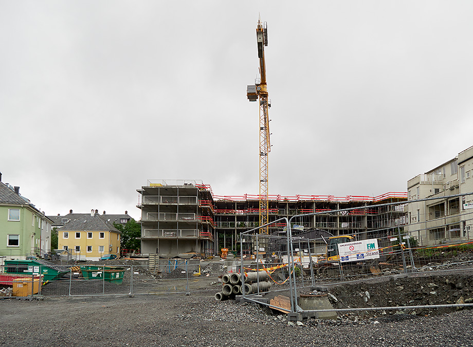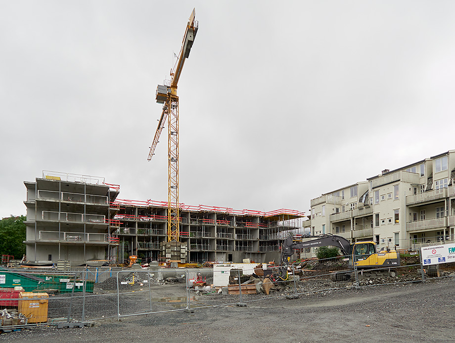 Byggingen av den første boligblokken mellom Inndalsveien og Solheimsvannet er godt i gang.