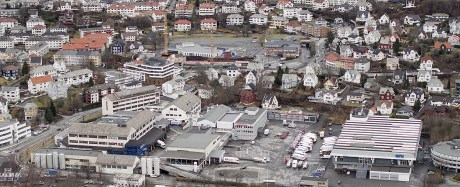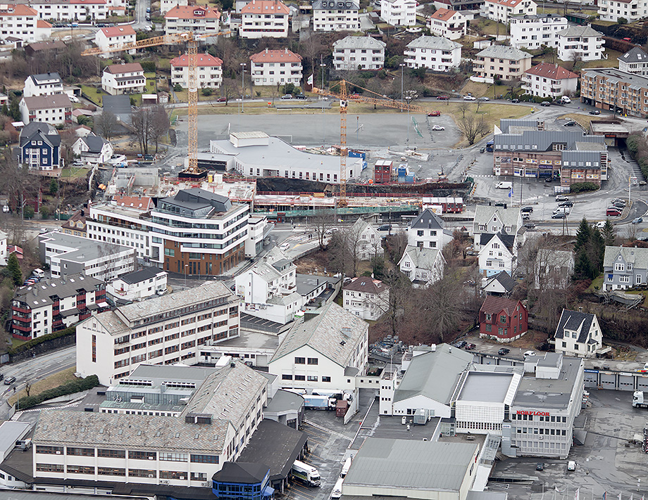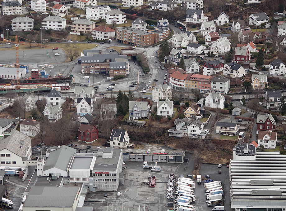 Bildene viser Wergeland sentrum med Tine og NRK i forgrunnen, Fageråsveien, Stortveitveien og Elvebakken.