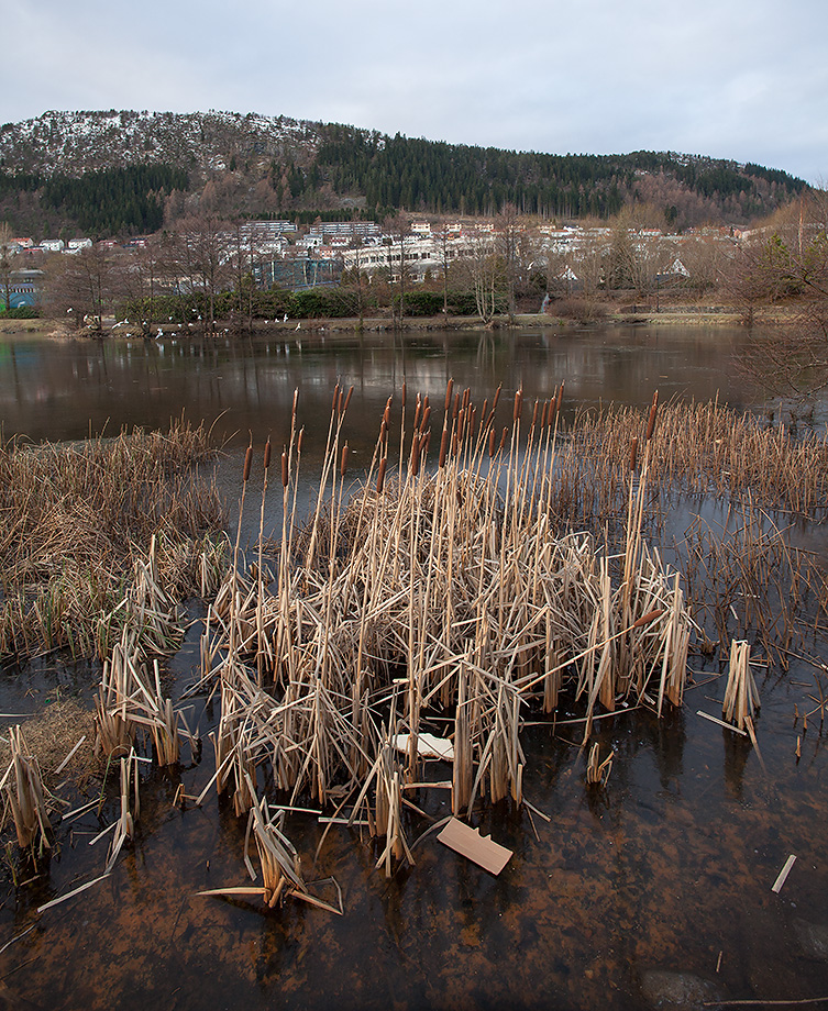 Her er frodig strandvegetasjon, blant annet med dunkjevle, Typha latifolia.