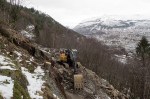 Høyt oppe i lia mot Løvstakken arbeider anleggsmaskinene videre med Løvstien. Nå er de kommet på høyde med Minde skole, eller litt lenger.