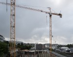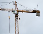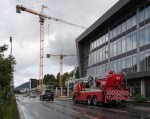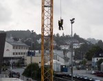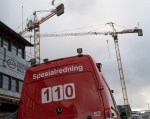 Brannkvinner og -menn bruker formiddagen til øvelse i redning fra en av kranene i Kanalveien.