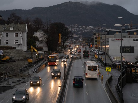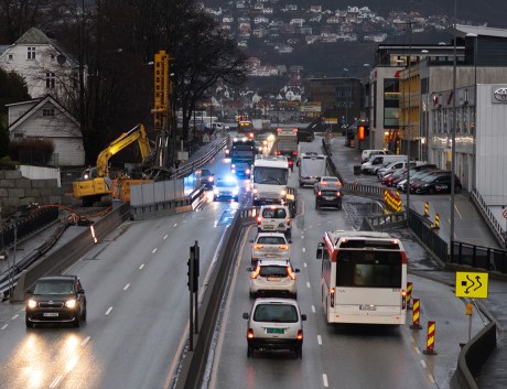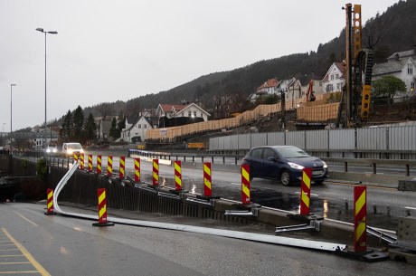 Fjøsangerveien er midlertidig lagt om i forbindelse med bygging av Bybanen over Mindemyren.