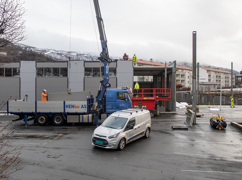 Elementene fraktes bort. Hallen skal gjenreises på Askøy.
