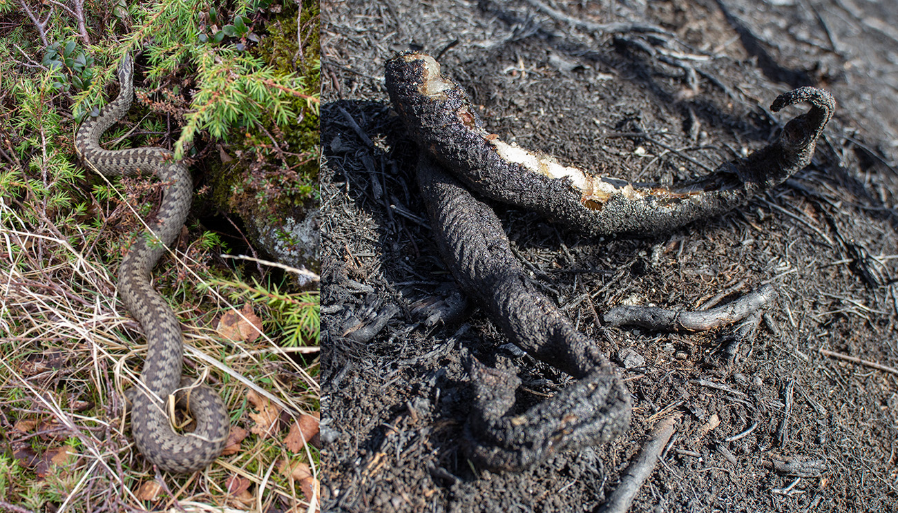 I fjor traff jeg en hoggorm på turen, i dag så jeg bare dette forbrente liket.