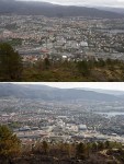 7. mai for nesten ett år siden gikk jeg stien under høyspenten opp mot Løvstakken. I dag gikk jeg omtrent samme rute, men unngikk hagen… Været er varmere, bjørka er grønnere, men ellers er det svartere enn i fjor. Jeg traff tre brannmenn som samlet sammen og tok med seg de siste slangene sine.