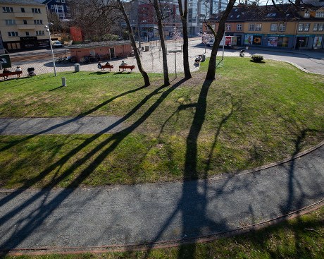 Men det er kommet en hengebjørk med rødt bladverk mellom de gamle og platanen som står lenger nord.