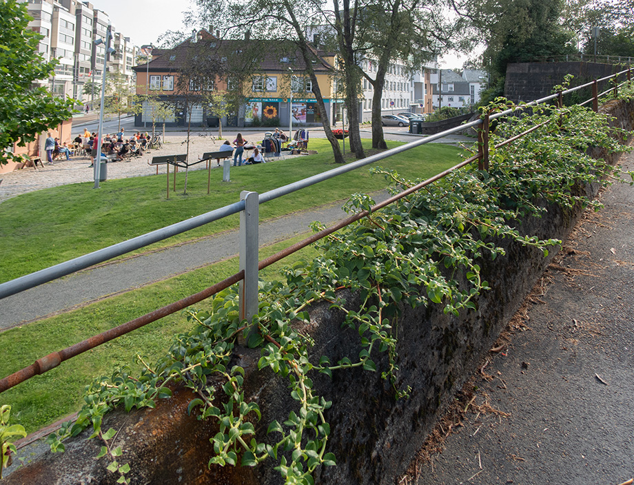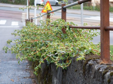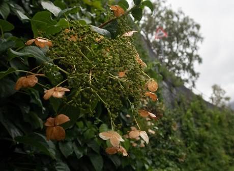 Klatrehortensia har imponerende vekstkraft. På muren ved Ambrosia Tønnesens plass har den vokst flere meter i sommer og har god fart over murkanten og inn i Svaneviksveien ovenfor.