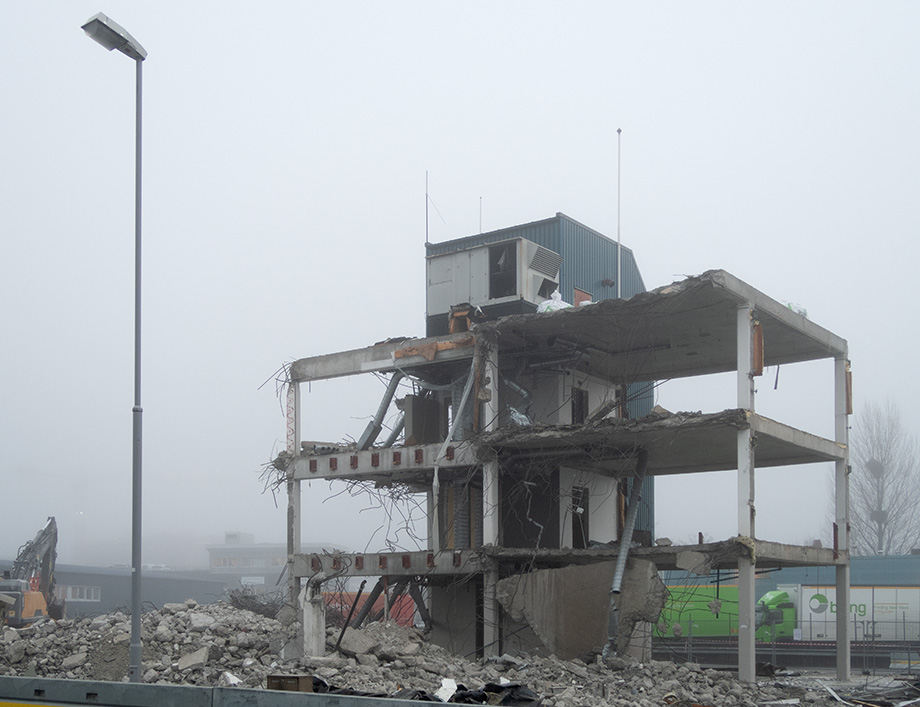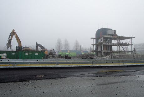 Bare trappehuset og litt til igjen av møbelbutikken. I tåka på Mindemyren i morges.