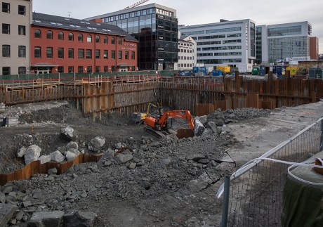 Bak gjerdet med automagisk kameraovervåking graves og sprenges det for Buebygget i Kronstadparken.