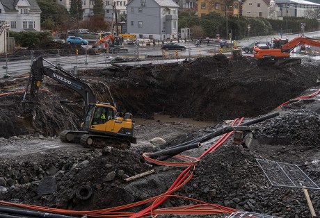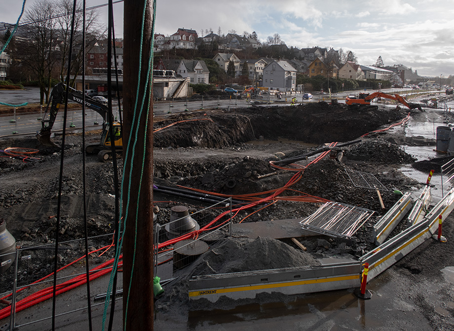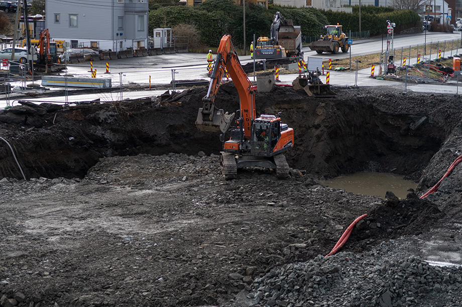 Enkelte steder må det graves dypt, og stein må fylles i myra før fjernvarme og bybanespor kan legges.