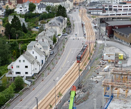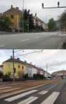 Det siste bildet er fra juni 2011 og viser den nordre enden av Inndalsveien. Da var Bybanen ett år gammel og Høgskulen på Vestlandet, den gang Høskulen i Bergen, var under bygging.