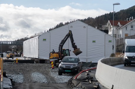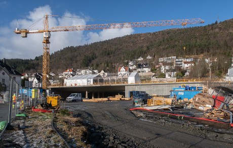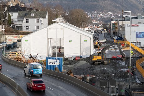 I forbindelse med støping av dekke over bybanestoppet på Kristianborg er det reist et deigert telt i svingen på Fjøsangerveien.