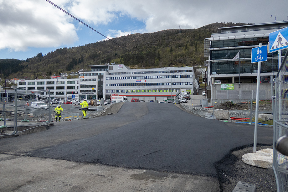 I går ble rundkjøringen i Kanalveien ved Kristianborg fjernet. Rørgaten for fjernvarme gjør en sving for å krysse veien, og Bybanetraséen, her.