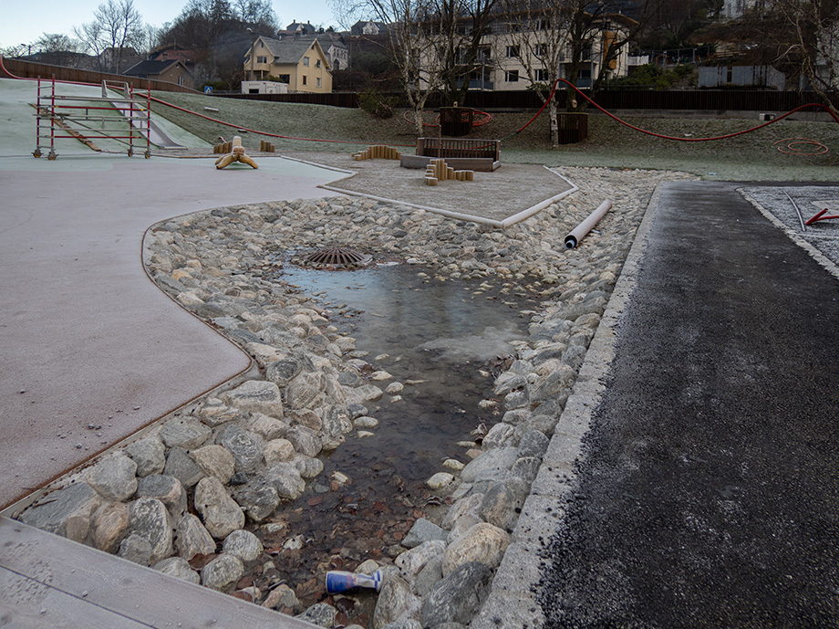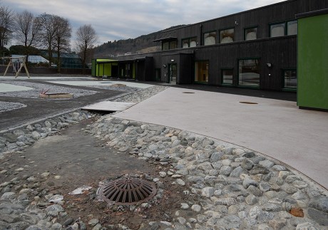 Barnehagen like ved er snart klar til å tas i bruk. Den har fått et lite vannanlegg på lekeplassen.