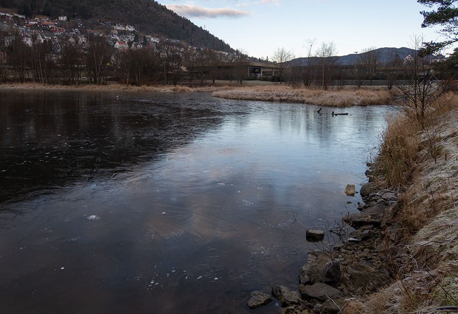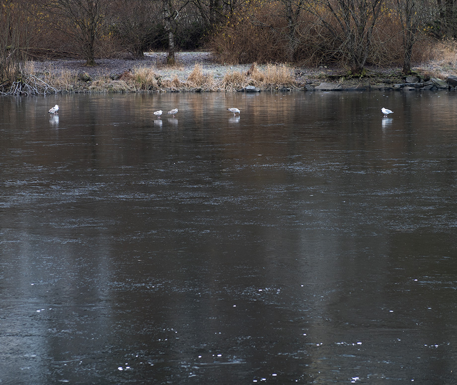 Isen begynner å legge seg på vannene på Mindemyren. Ennå kan den ikke bære annet enn fugler, som her på Kristianborgvannet.