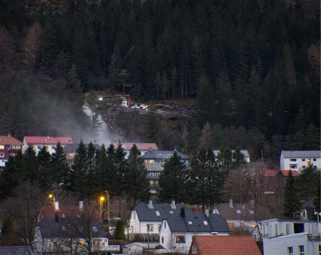 Maskinene spiser seg fremover i bratthenget over bebyggelsen på Løvstakksiden.