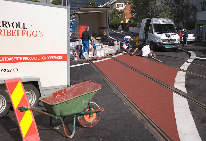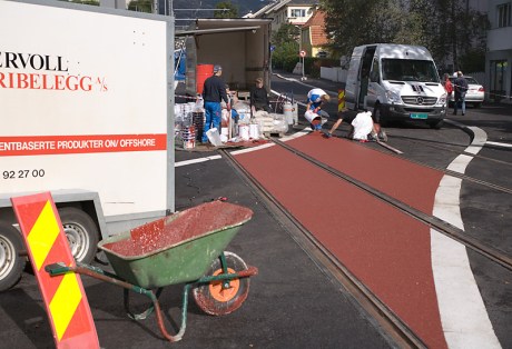 Det legges rød masse mellom skinnene der biltrafikken skal krysse bybanen. Den største kryssingen blir i Minde Allé.