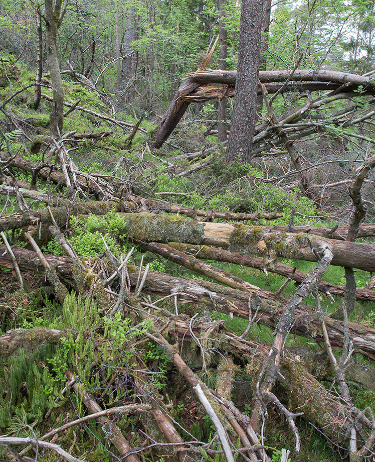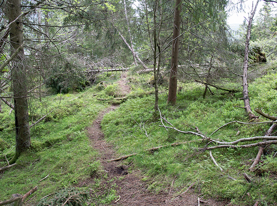 En av stiene jeg ofte følger mot Løvstakken nås via Blekenberg og Løvstakklien. Den går gjennom et område med store mengder vindfall av nyere og eldre dato. På grunn av alle vindfallene har stien endret trasé mange ganger.