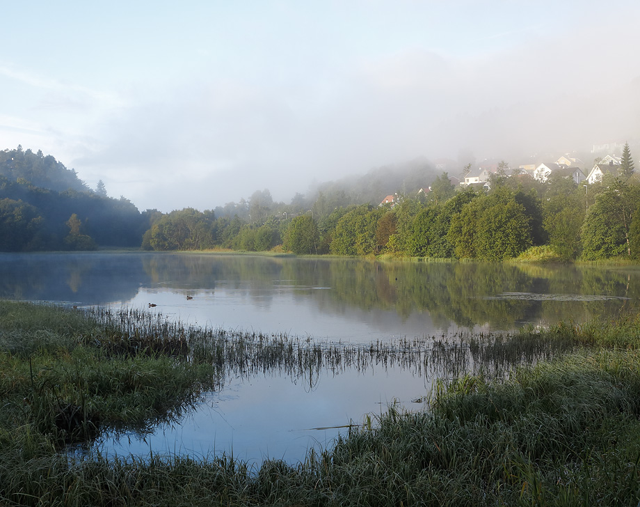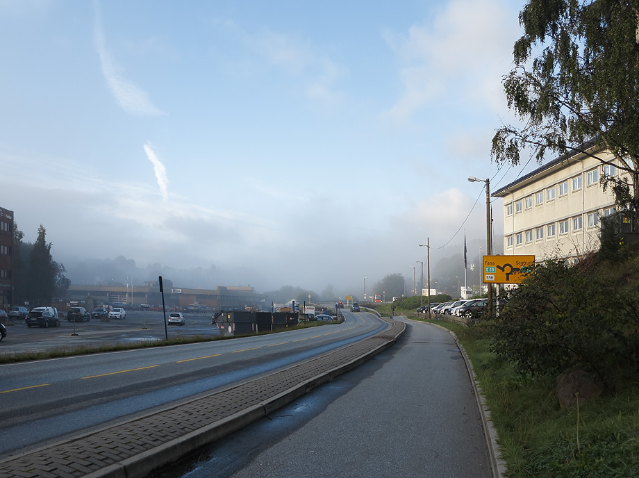 Kjølig morgen og varmt hav presser havtåke inn i Bergensdalen.