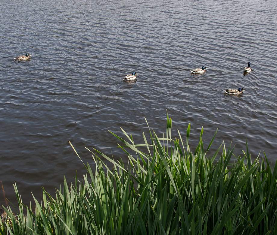 På Solheimsvannet padler noen stokkandriker hvileløst omkring.
