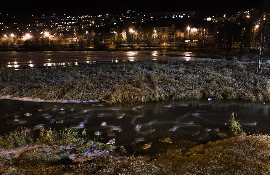 Om kvelden blir alle farger forvrengt i det kraftige lyset fra lyskasterne på terminalen på Mindemyren.
