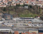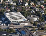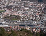 Bildet viser sentrale områder av Mindemyren høsten 2009, med jernbaneområdet og Leaparken midt på bildet. Minde Allé til høyre.