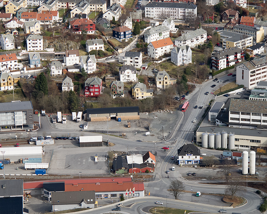 Bildet viser sentrale områder av Mindemyren høsten 2009, med jernbaneområdet og Leaparken midt på bildet. Minde Allé til høyre.
