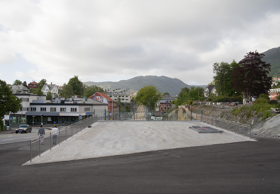 Den steinsatte «plassen» over bybaneinngangen er nå ferdig. Tidligere bilde HER.