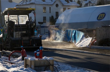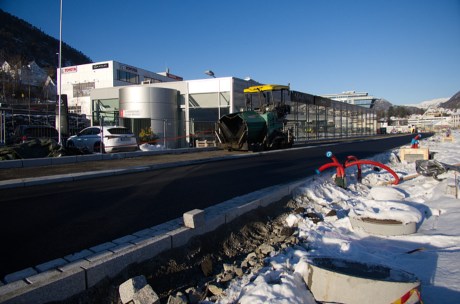 Gang- og sykkelveien, i sin endelige form (tror jeg), nordover fra bybanestoppet på Kristianborg, blir asfaltert.
