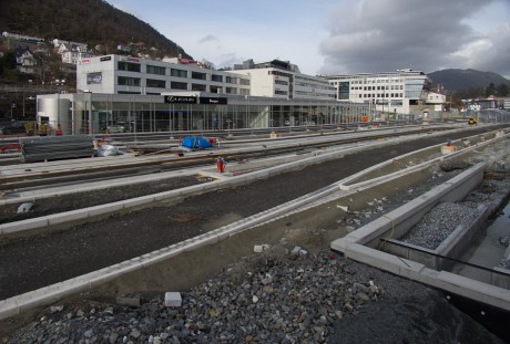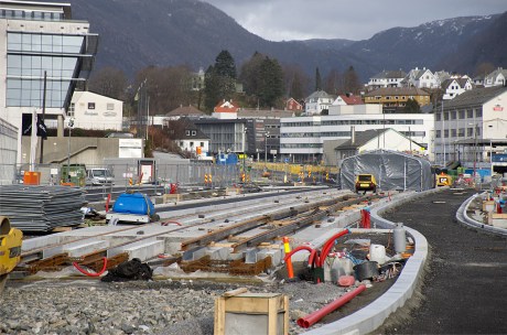 Riving, ombygging og nybygg der Bybanen krysser seg selv på Kronstad.