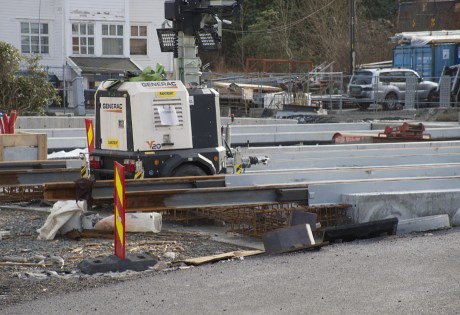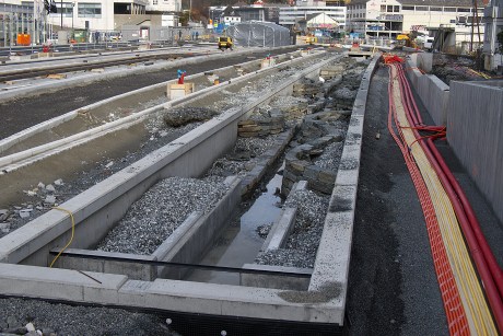 Det legges skinner for bybanen på Kristianborg.