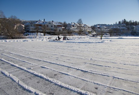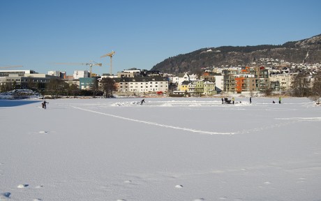 Det har ikke vært sikker is på Solheimsvannet siden 2013. Da varte herligheten bare et par dager. I 2011 var det sikker is et par uker. Nå er isen 20 cm og noen har brøytet en stor skøytebane. Det kan se ut som Bergen kommune har gitt opp å kontrollere isen her for det er ingen kommunale skilt å se.