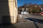 En kikk inn mellom det nyinnflyttede OBOS-bygget i Kronstadparken og den gamle LUNA-fabrikken som skal bli barnehage.