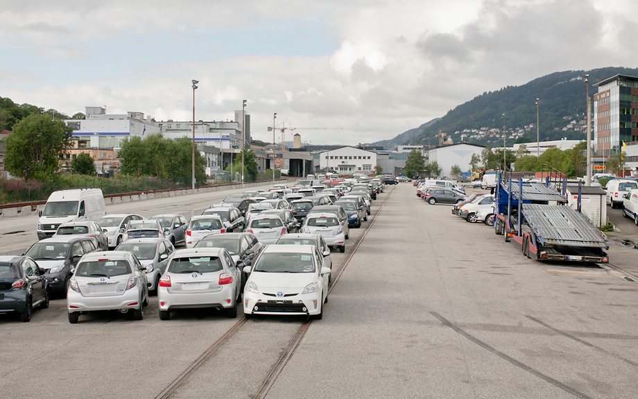 På jernbanetomten losses mange av de nye bilene som kommer til Bergen. BT melder at en Volvo ble ribbet til felgen her.