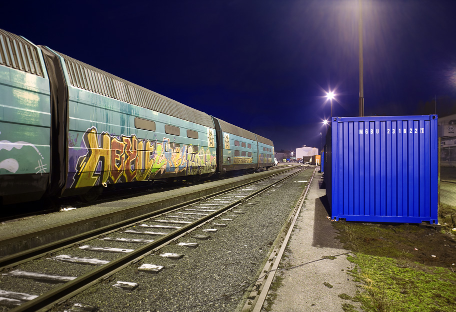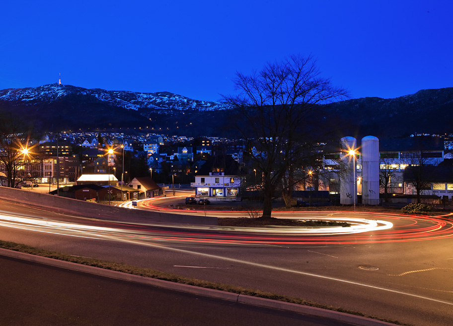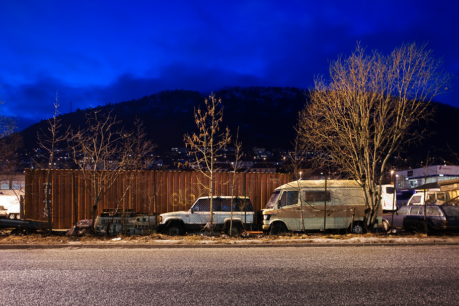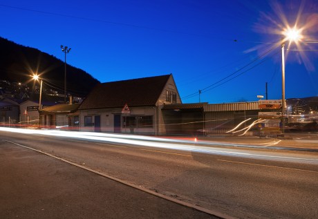 Om kvelden blir alle farger forvrengt i det kraftige lyset fra lyskasterne på terminalen på Mindemyren.