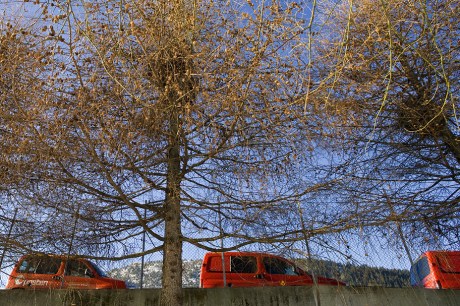 Ved postterminalen mot Solheimsvannet står en rad lerketrær. I nesten hvert tre er et skjærereir og bak nesten hvert tre står en postbil.