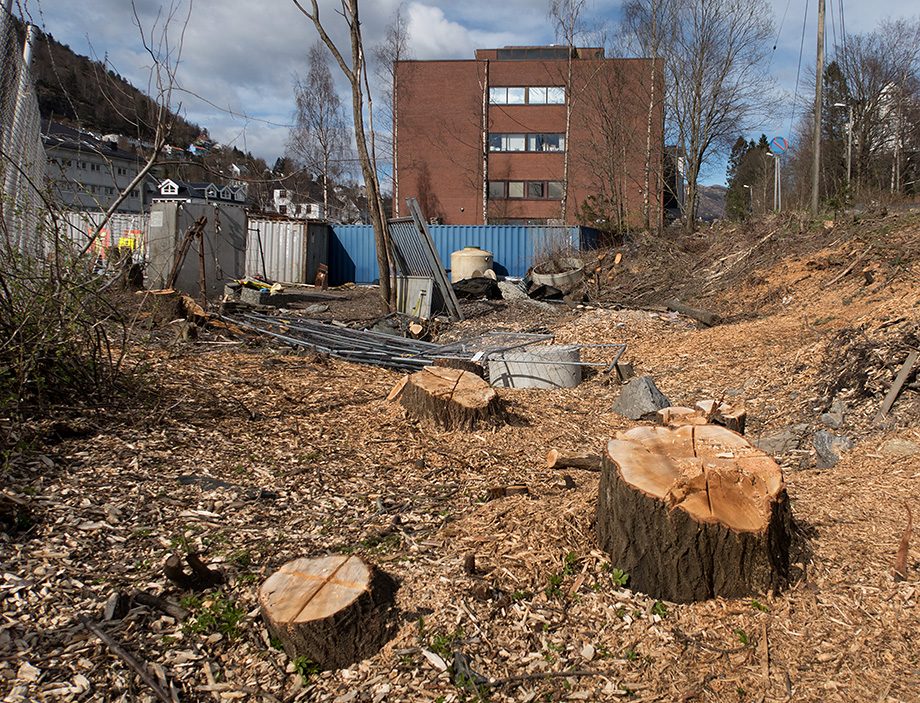 Inntil Conrad Mohrs vei, ved BIR, er et skogholt ryddet. I sørenden er det blitt plantet noen busker.