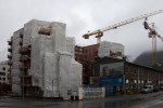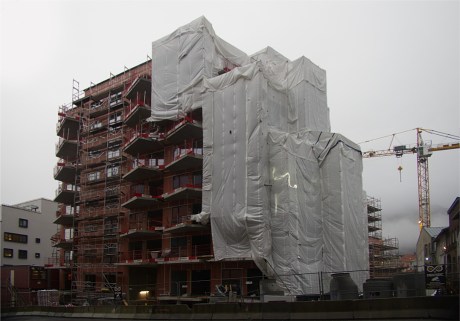Hus A i Kronstadparken, trinn 3, har stått delvis tildekket av presenninger noen uker. Bygging av hus B og C er godt i gang.