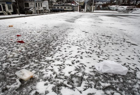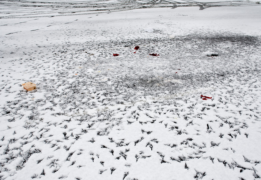 Tydelige spor etter kråkenes fest på nattmat etterlatt midt på parkeringsplassen, Wergeland.
