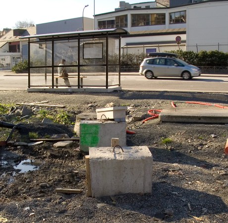 Før bussruten (midlertidig?) ble lagt om i forbindelse med bygging av bybanen, ble bygget til Minde trelast/Gulvspesialisten i Minde Allé revet.